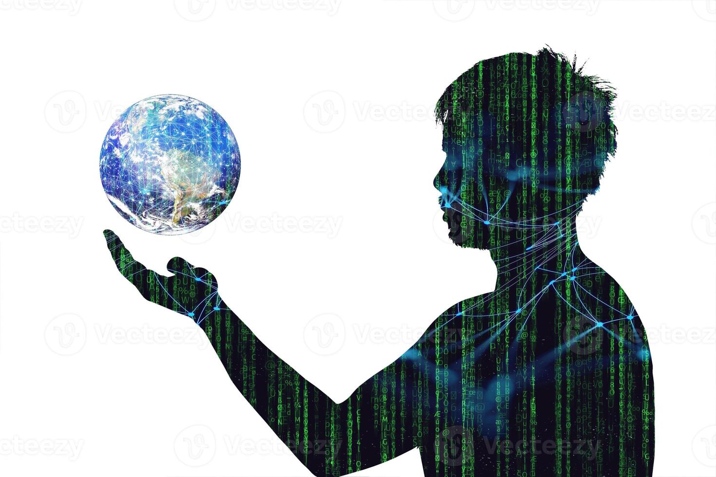 Concept of communication technology and internet networking. silhouette of a man with a globe in his hand Pro Photo
