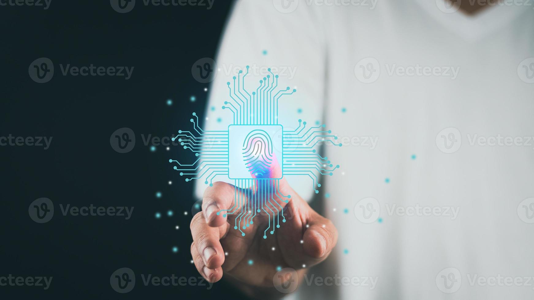 cyber security concept, man's hand scanning finger to go online to access information both accessing the system document storage Banking including online shopping This method is highly secure. Pro Photo