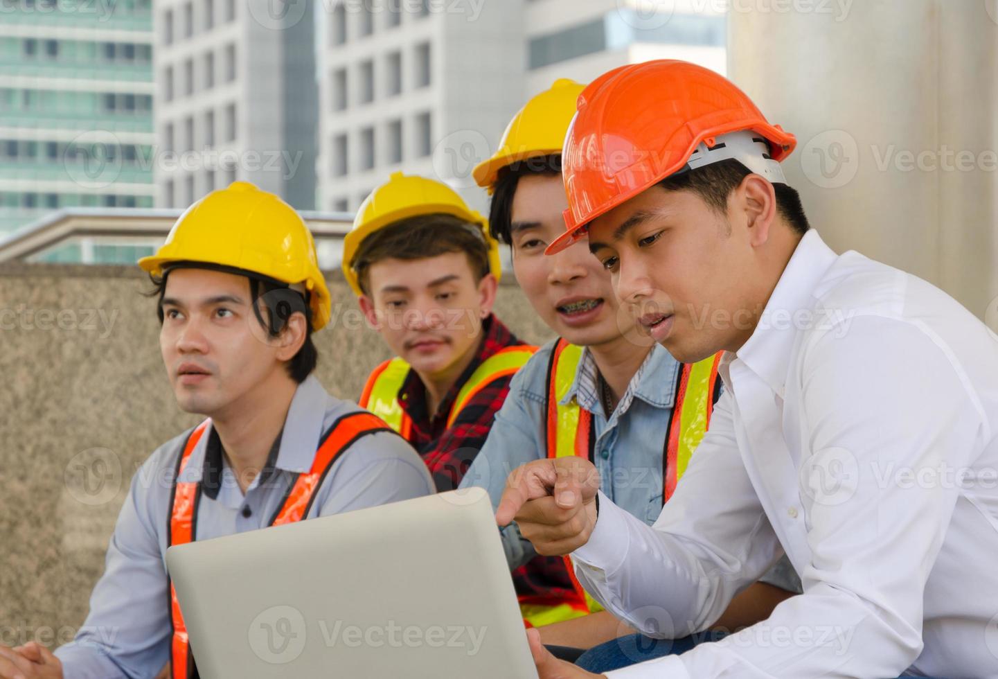 Engineering team working together on building site and using laptop for project progress Pro Photo