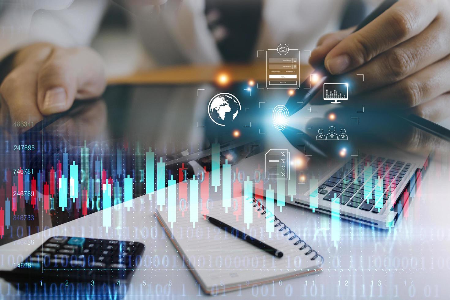 Online transactions, Businessman touching fingerprint scan provides security interface payment shopping banking and cloud computing network connection on virtual screen. photo