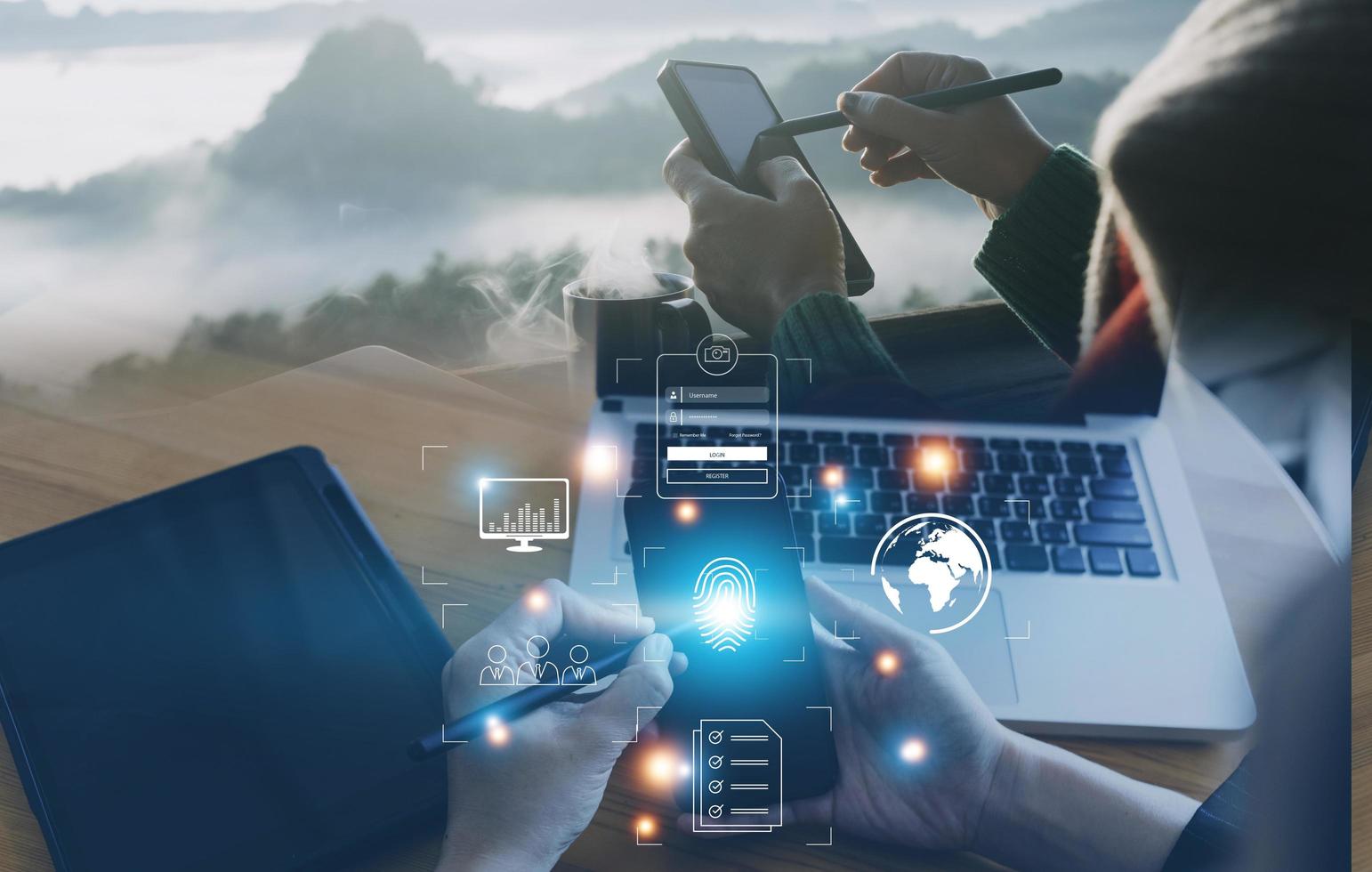 Online transactions, Businessman touching fingerprint scan provides security interface payment shopping banking and cloud computing network connection on virtual screen. photo