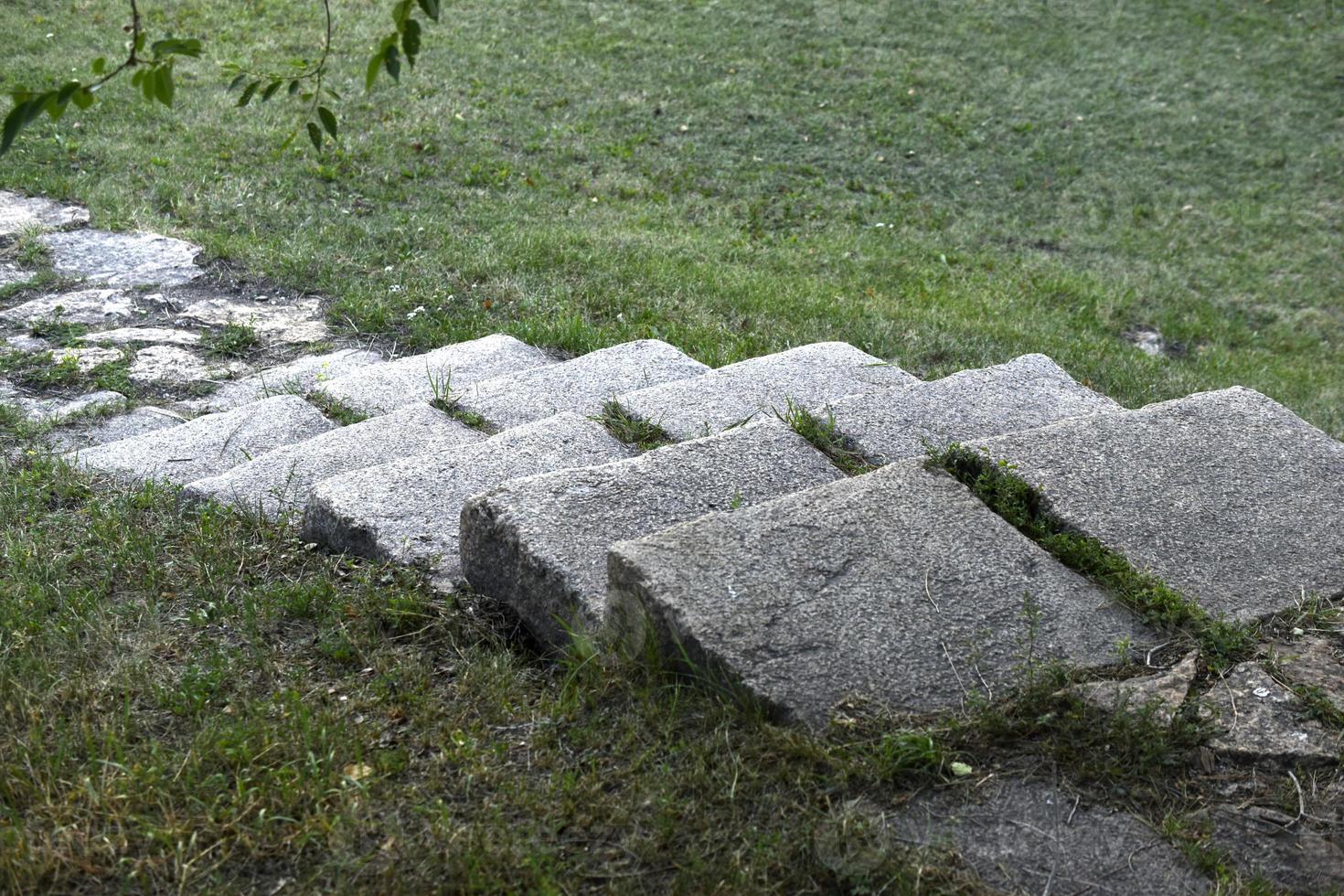 A stone path in the park and a granite staircase with steps. Stone steps in the garden. Pro Photo