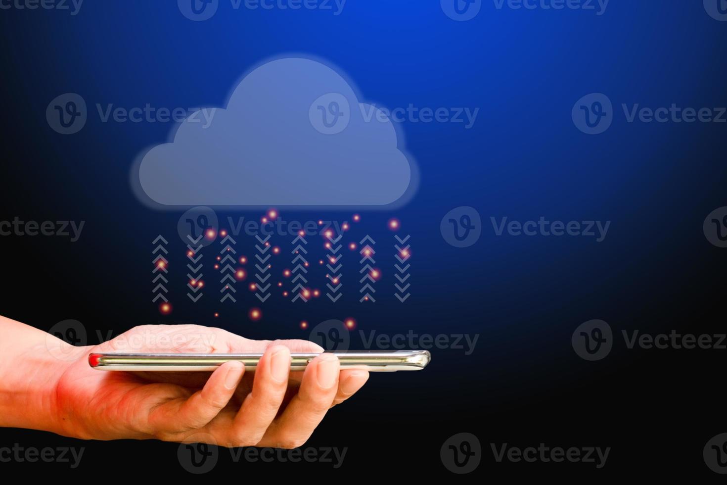 Cloud data storage concept. Hand hold cloud computing with transfer arrow on blue background. Communication of business and financial. Large database and synchronize with the internet and technology. Pro Photo