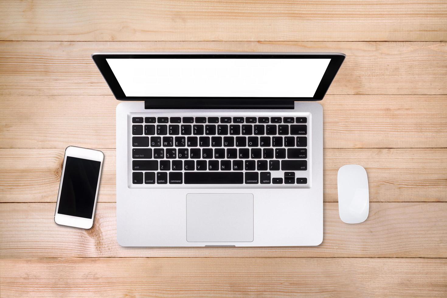 Top view laptop computer with mobile phone on wood table.Business template mock up for adding your text. Free Photo