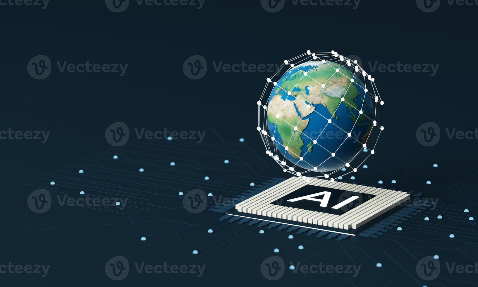AI, Artificial Intelligence concept AI circuit board with electronic system wiring with a globe background, 3d rendering,conceptual image. Pro Photo