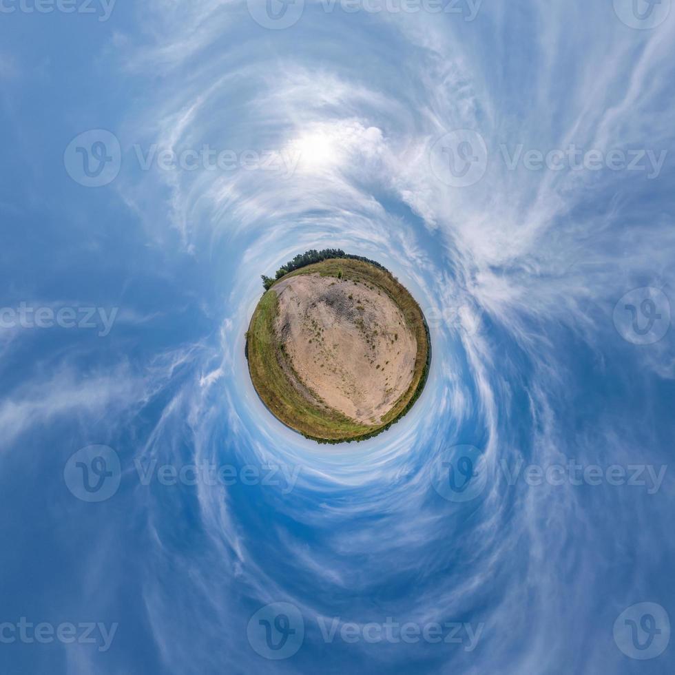 tiny planet transformation of spherical panorama 360 degrees. Spherical abstract aerial view in field with clear sky and awesome beautiful clouds. Curvature of space. Pro Photo