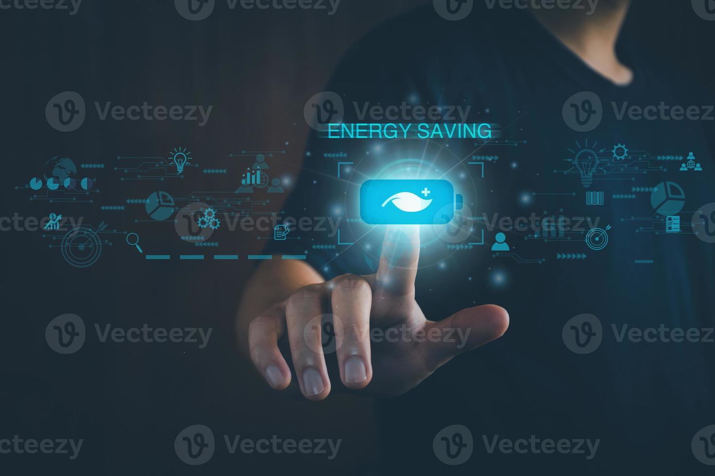 Energy saving concept. Person touching the battery saver button. On the virtual screen, help save energy, reduce global warming, save the environment, reduce pollution, eco-technology. Pro Photo