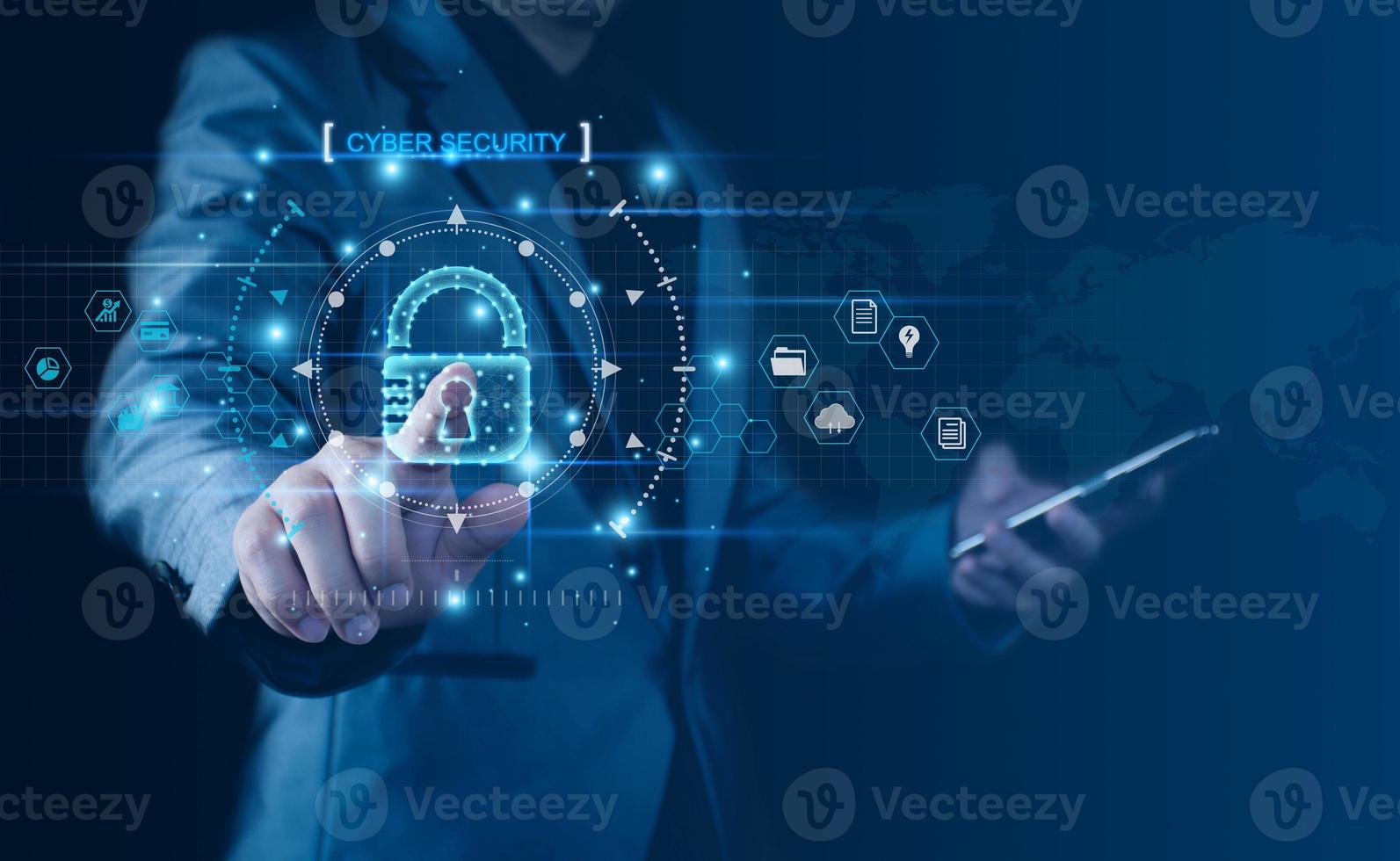 Cyber security network. Padlock icon and internet technology networking. Businessman protecting data personal information on tablet and virtual interface. Data protection privacy concept. GDPR. EU. Pro Photo