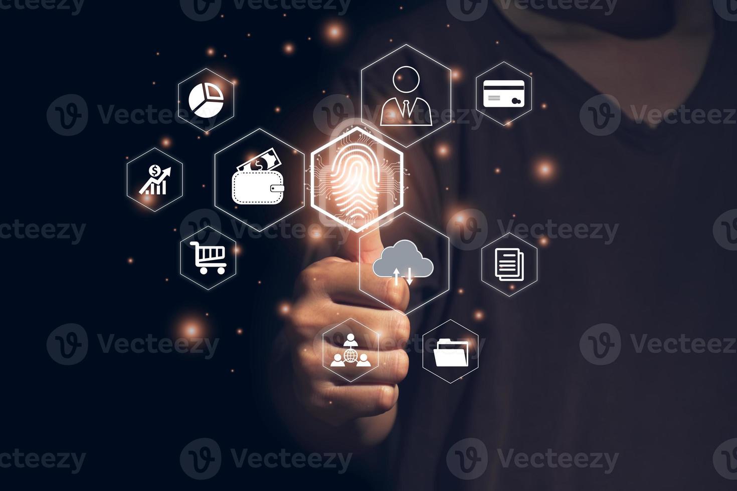 Person touching virtual screen to scan fingerprints, digital security management concept. Internet of things, business processes, storage systems, cloud computing, e-commerce, online transactions Pro Photo