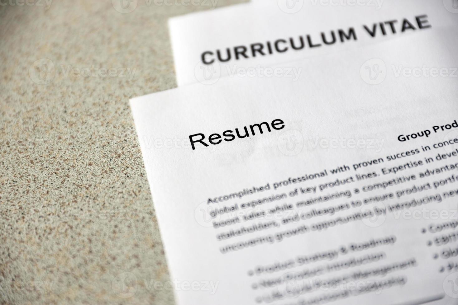 Top view of stack of office documents including resume and cv forms on the desk. Job seeking process. Hunting for workplace Pro Photo