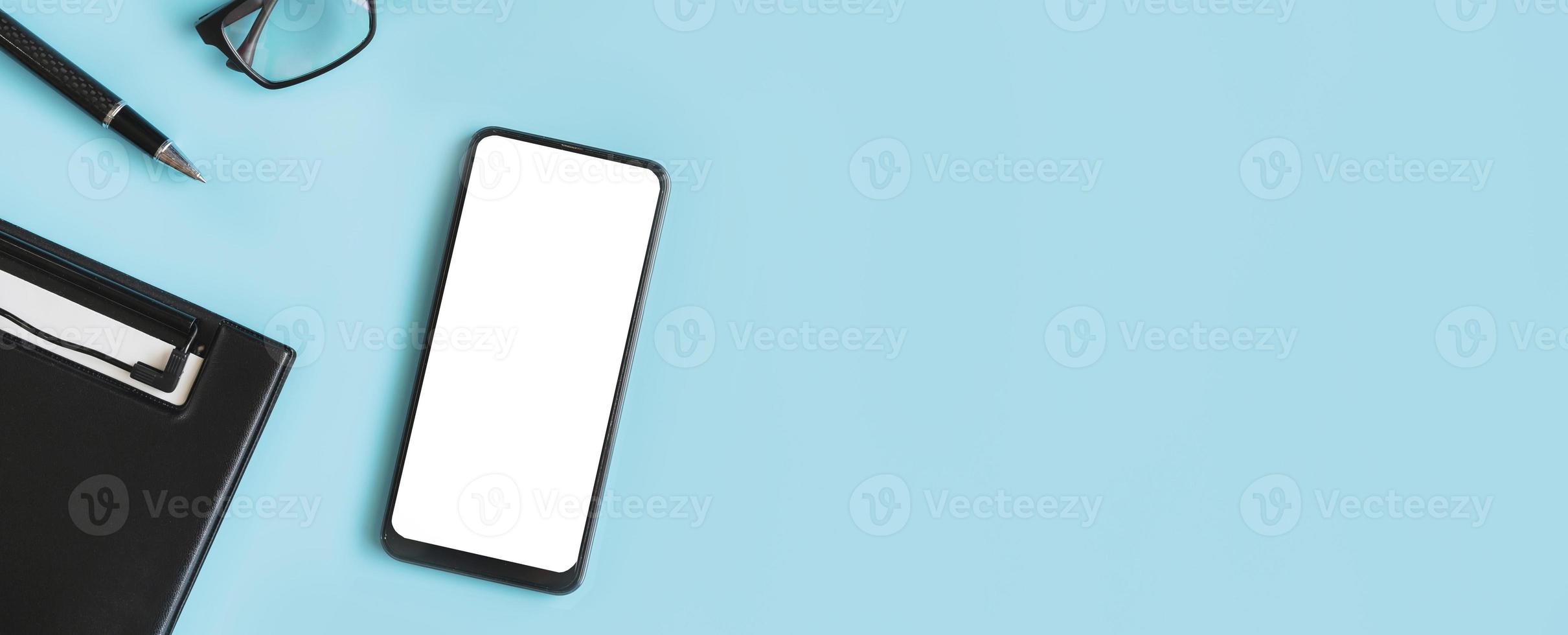Empty screen Smart phone and file folder on business desk office with copy space, Top view Pro Photo