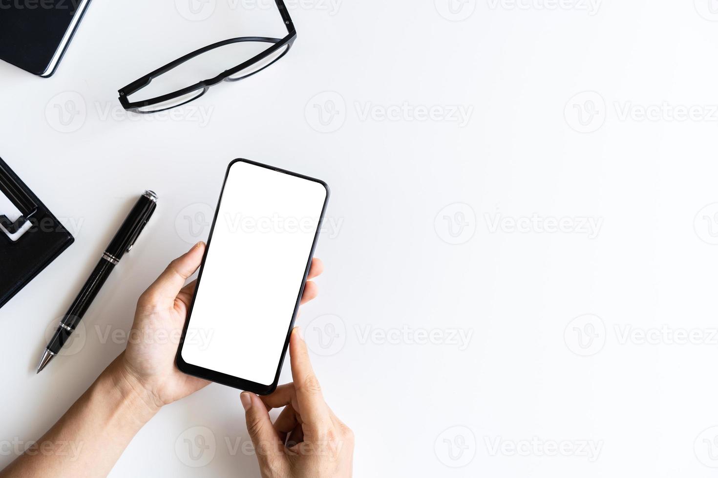 Hand holding empty screen Smart phone and file folder on business desk office with copy space, Top view Pro Photo