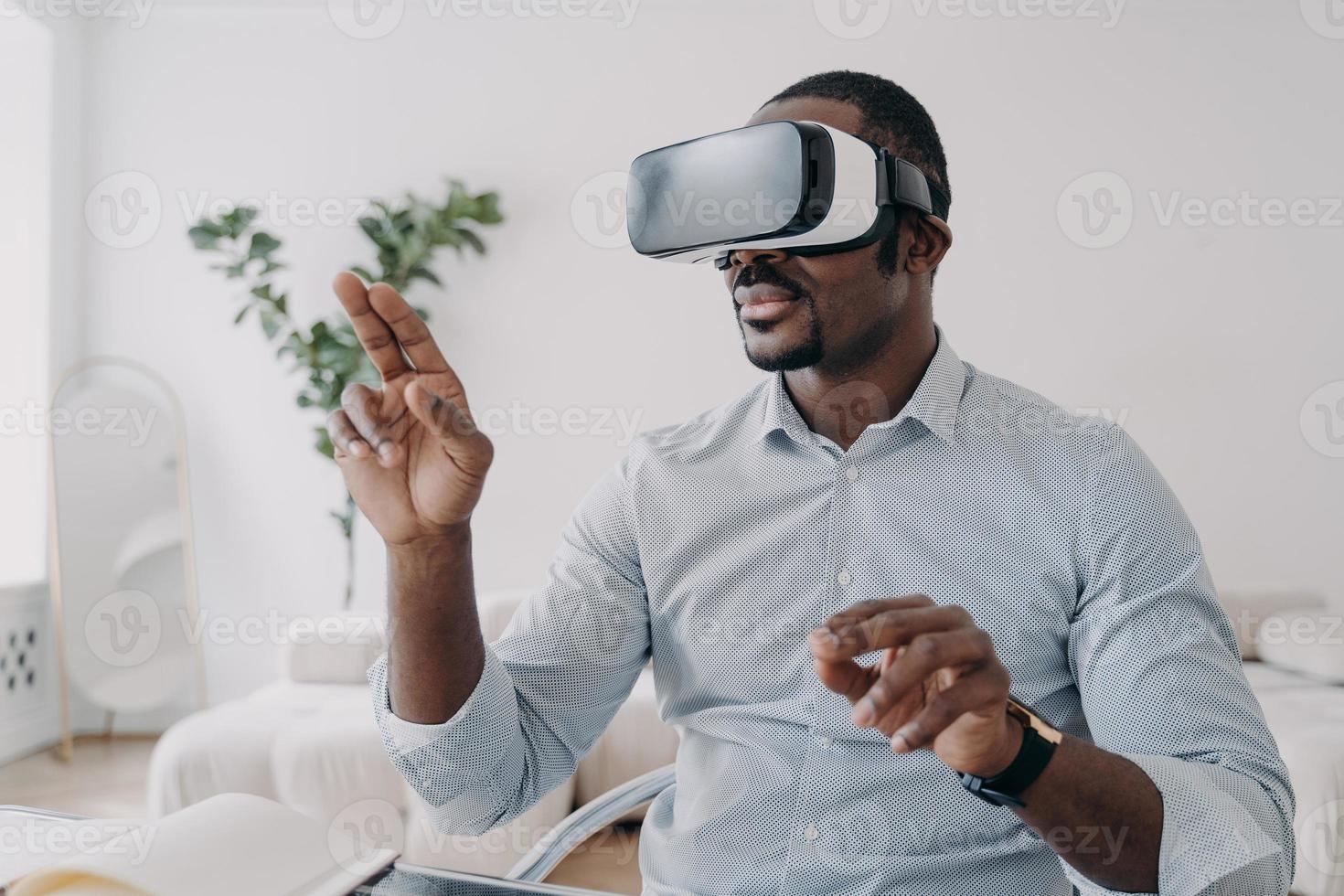 African american man developer in VR glasses use virtual reality modeling software. Future high tech Pro Photo