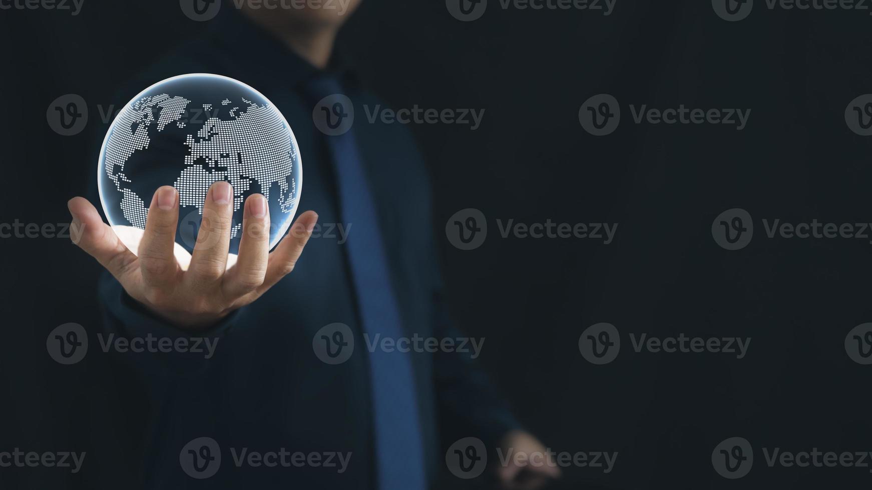 Businessman holding global network connection on social networking and customer data analytics, Business strategy and smart intelligence, digital marketing, Technology and global business. Pro Photo