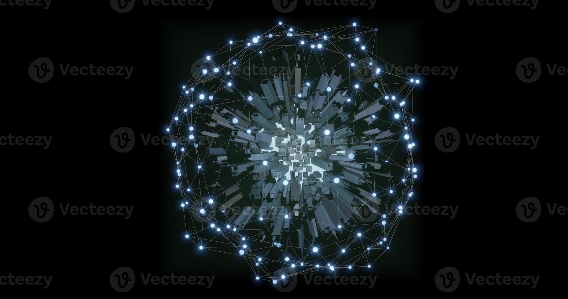 3D rendering of abstract scale-up geometric city on the world in global futuristic cyber-network. Neural network grid line around globe. Pro Photo