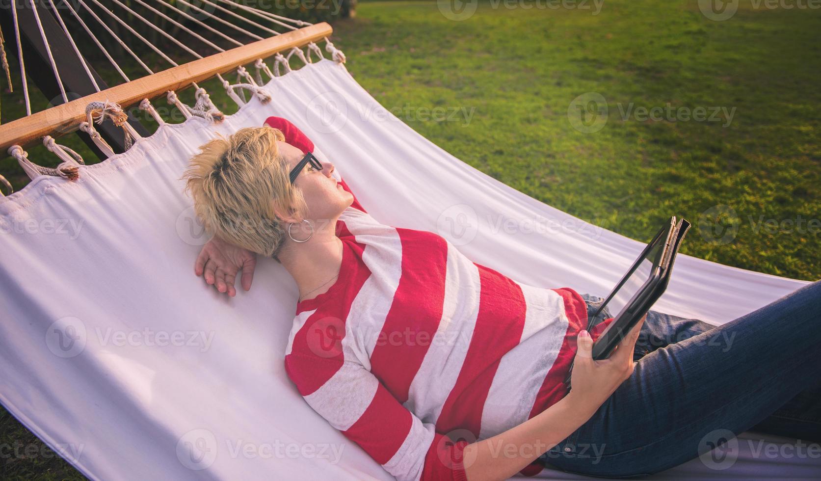 woman using a tablet computer while relaxing on hammock Pro Photo