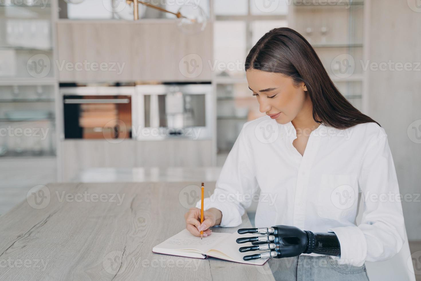 Modern disabled girl with bionic prosthesis hand writing in notebook, sitting at table at home Pro Photo