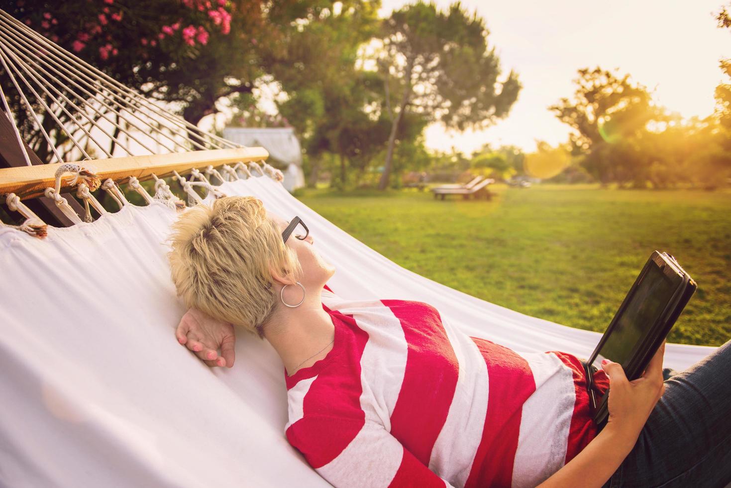 woman using a tablet computer while relaxing on hammock photo