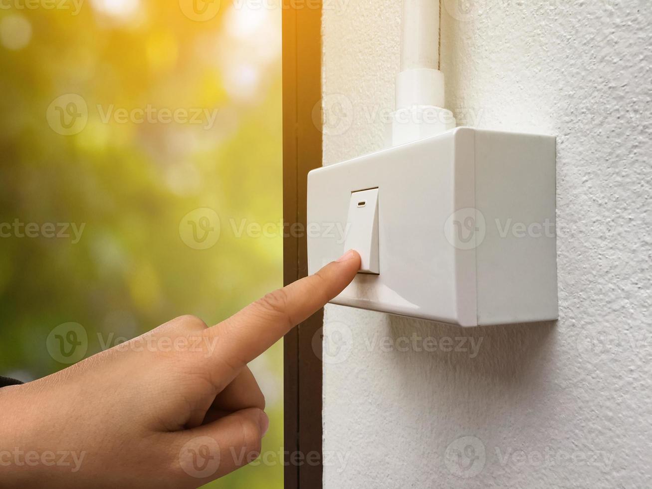 Human finger on the switch on and switch off panel, concept for turn off the electric lamp after using it , before going out and to save our planet and global warming, soft and selective focus. Pro Photo