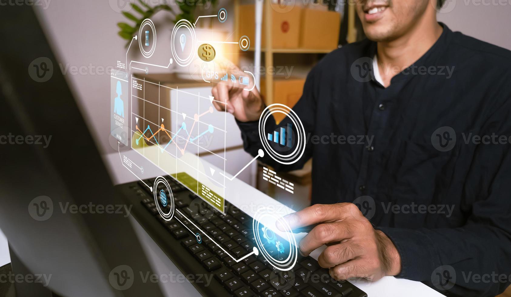 Hand hold Business brainstorm Ai financial analysis graph economic growth big data tech dashboard technology digital global network marketing connection metaverse 3D virtual analysis screen Concept Pro Photo