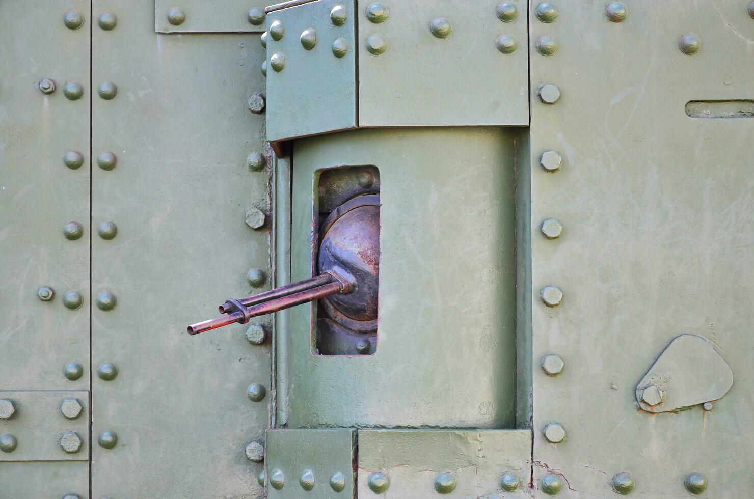 The texture of the wall of the tank, made of metal and reinforced with a multitude of bolts and rivets. Images of the covering of a combat vehicle from the Second World War with a guided machine gun