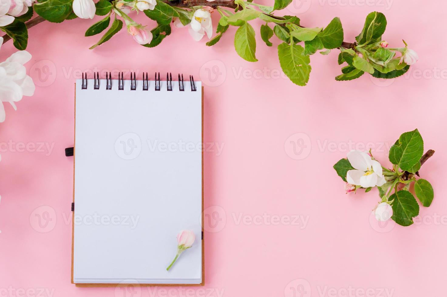 Creative flat lay of blank spiral notepad frame mock up and apple tree flowers petals on pastel pink background with copy space in minimal style, template for lettering, text or your design Pro Photo