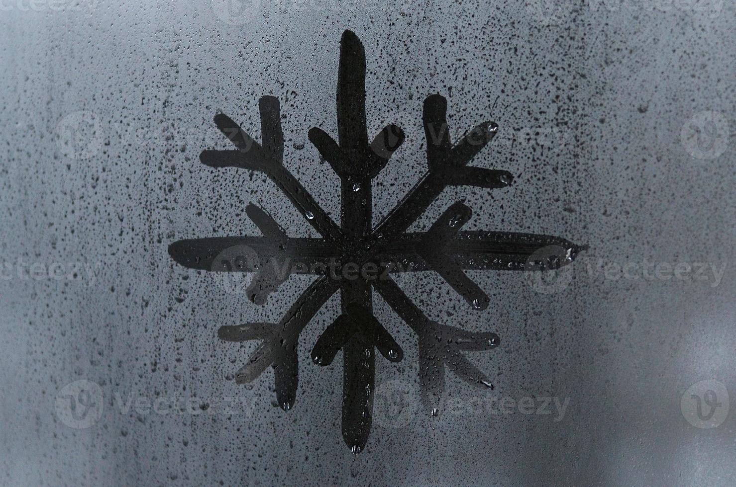 The image of the snowflake is drawn with a finger on the surface of a misted glass window. Frosty weather Pro Photo