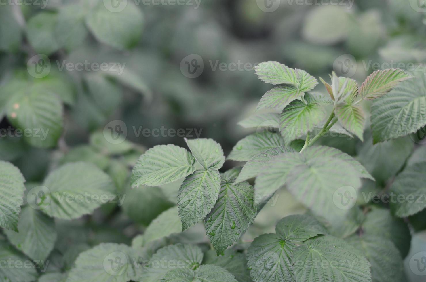 Photo of a few green leaves from a raspberry bush. Growing bush of raspberry. Macro photo with blurred background Pro Photo