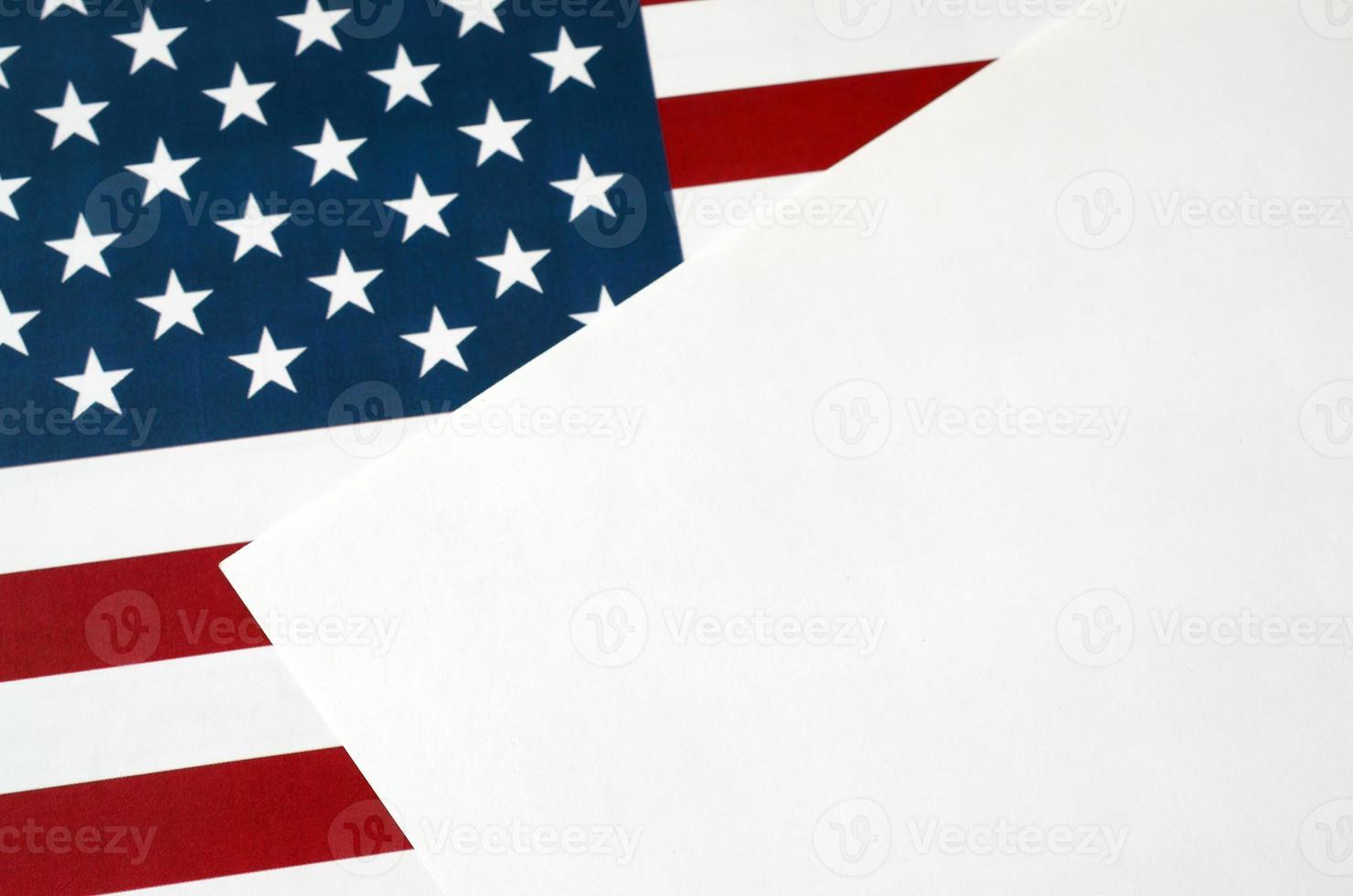 Empty blank a4 paper document on United States flag close up. Template for design with US flag Pro Photo