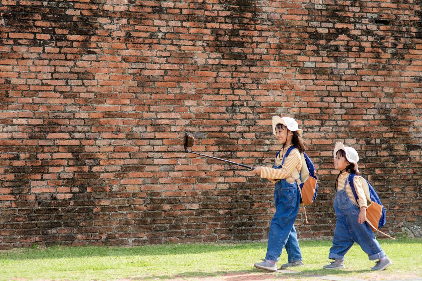 Two Asian children girls are bloggers. Broadcast on the Internet. Record vlog and blog subscribers. Record video lessons for Internet. Use camera with tripod. Pro Photo