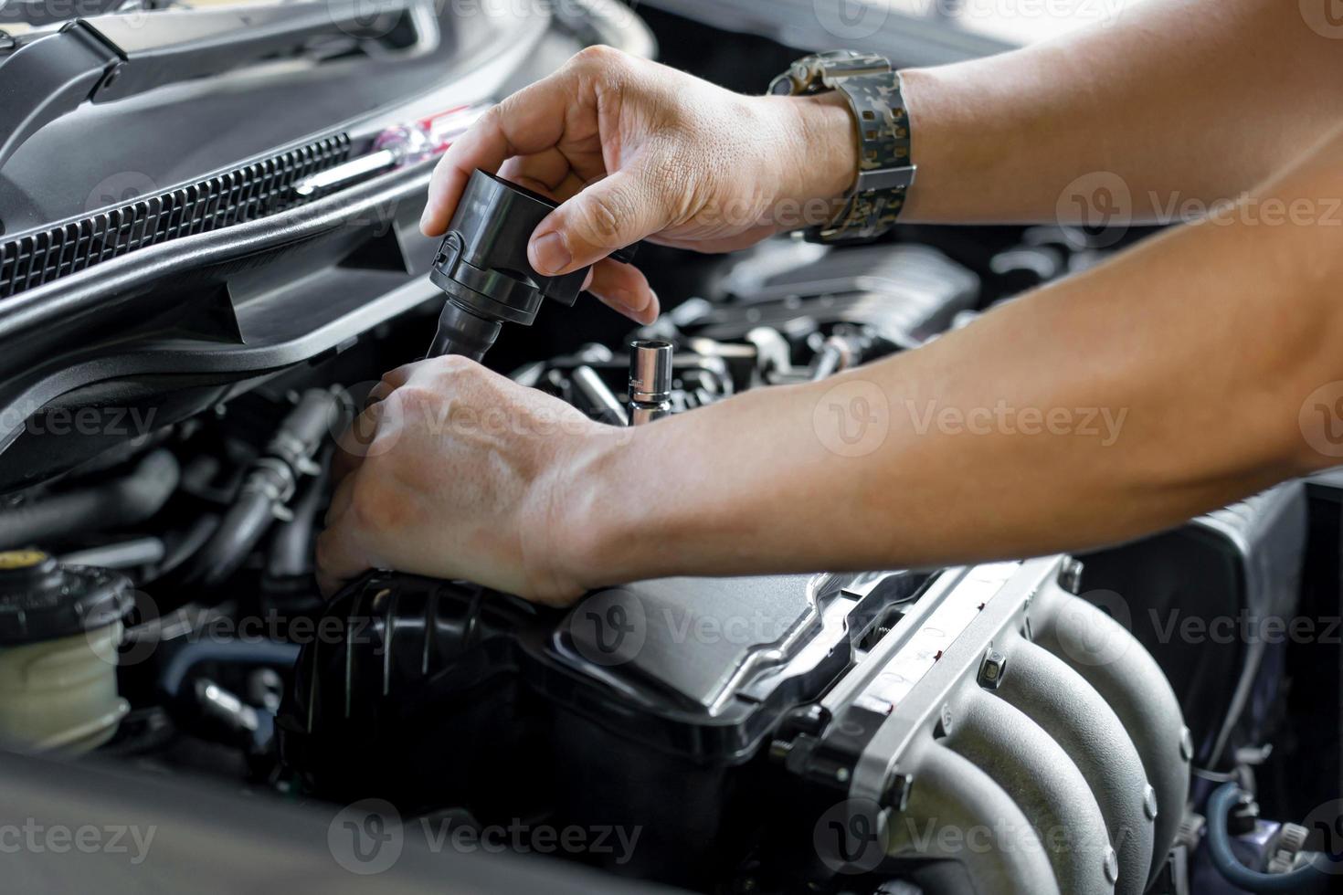 Close up spark plug coil in hand a man remove from the gasoline engine service in garage and engine room background Pro Photo