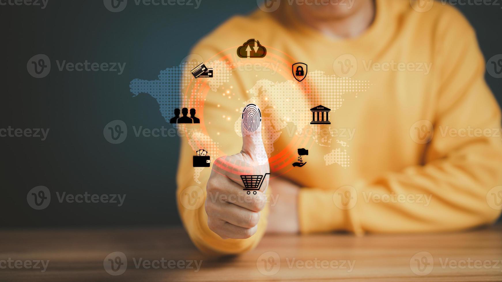 Concept of Surveillance and security scanning of digital program cyber futuristic application. Futuristic digital processing of biometric identification fingerprint scanner for access personal data. Pro Photo
