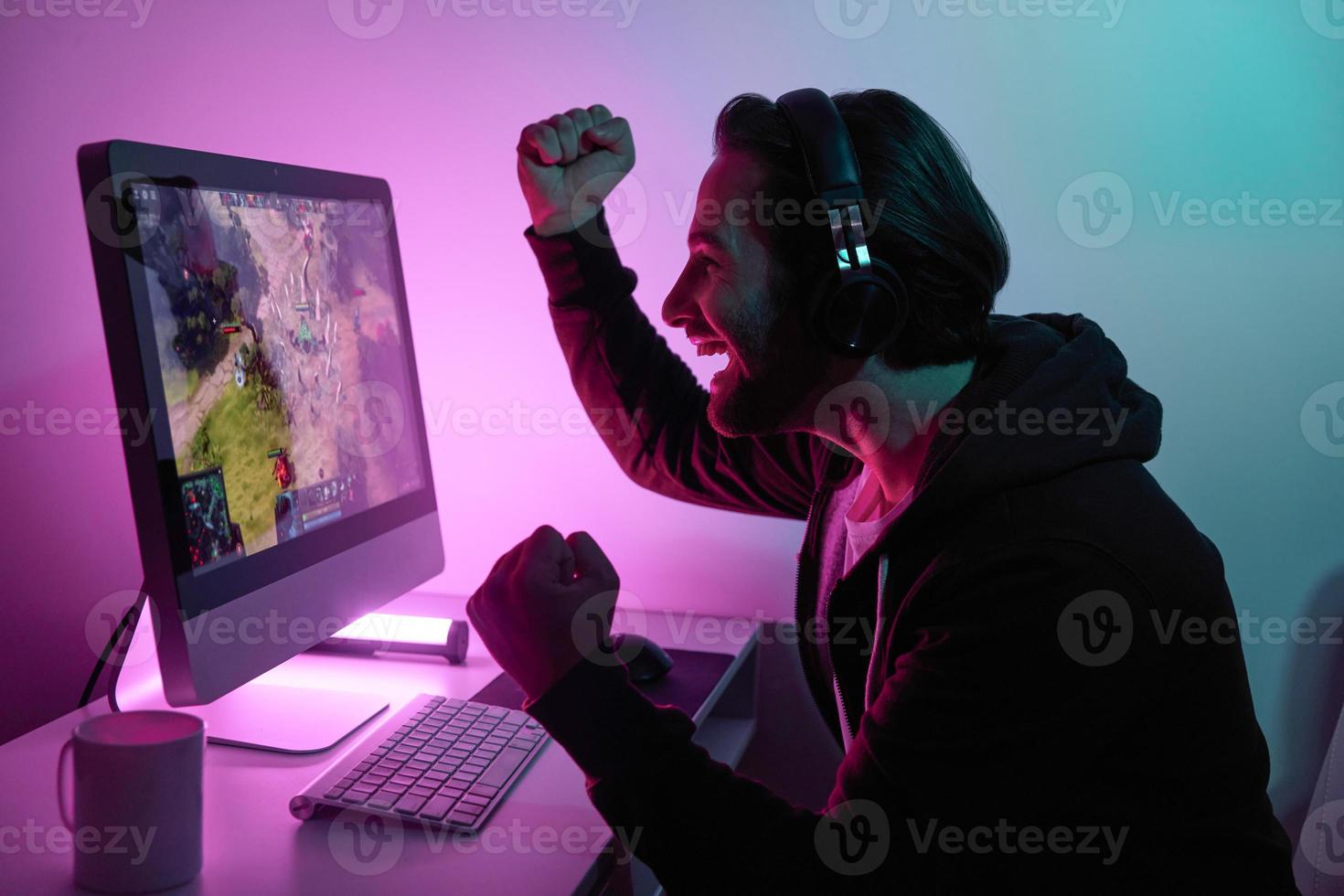 Side view of happy man gesturing while playing computer game against colorful background Pro Photo