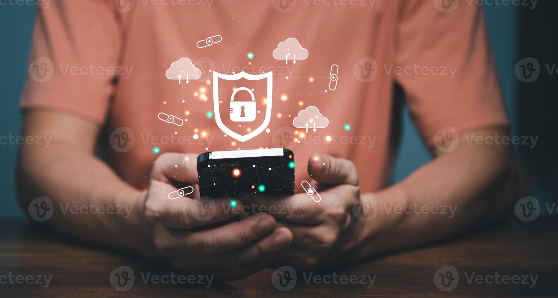 Cyber security connection shield technologies background, Human finger touching on mobile phone with global network linking technology. Pro Photo