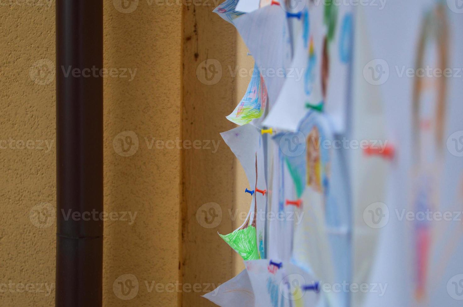 Sheets of paper, notes, drawings, documents pinned to a blackboard, a wall for a reminder, submission of announcements, scheduling and copy space. Background, texture Pro Photo