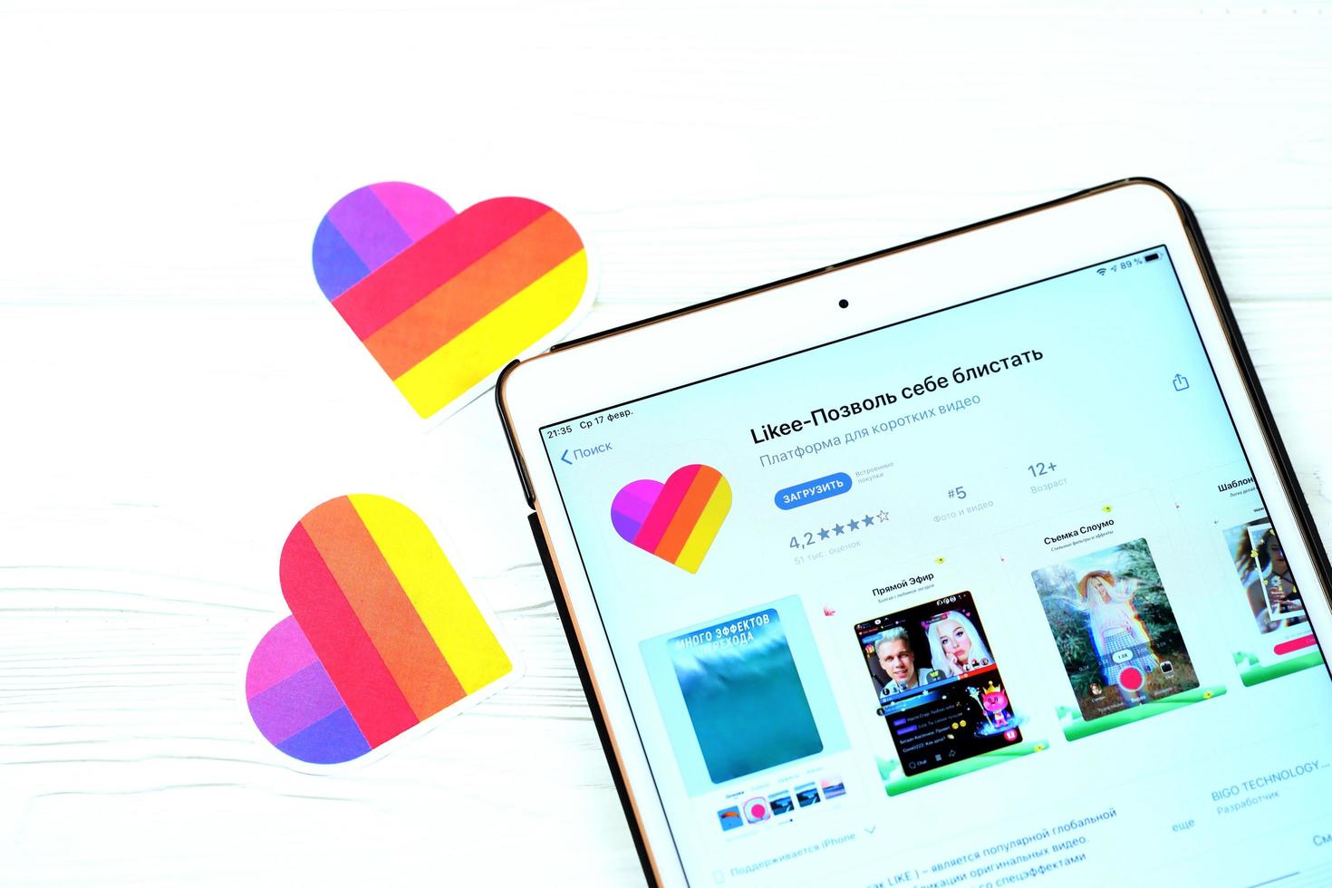 KHARKOV, UKRAINE - FEBRUARY 14, 2021 Likee app in app store market on ipad display screen. Likee is a short video creation and sharing app available for iOS and Android photo