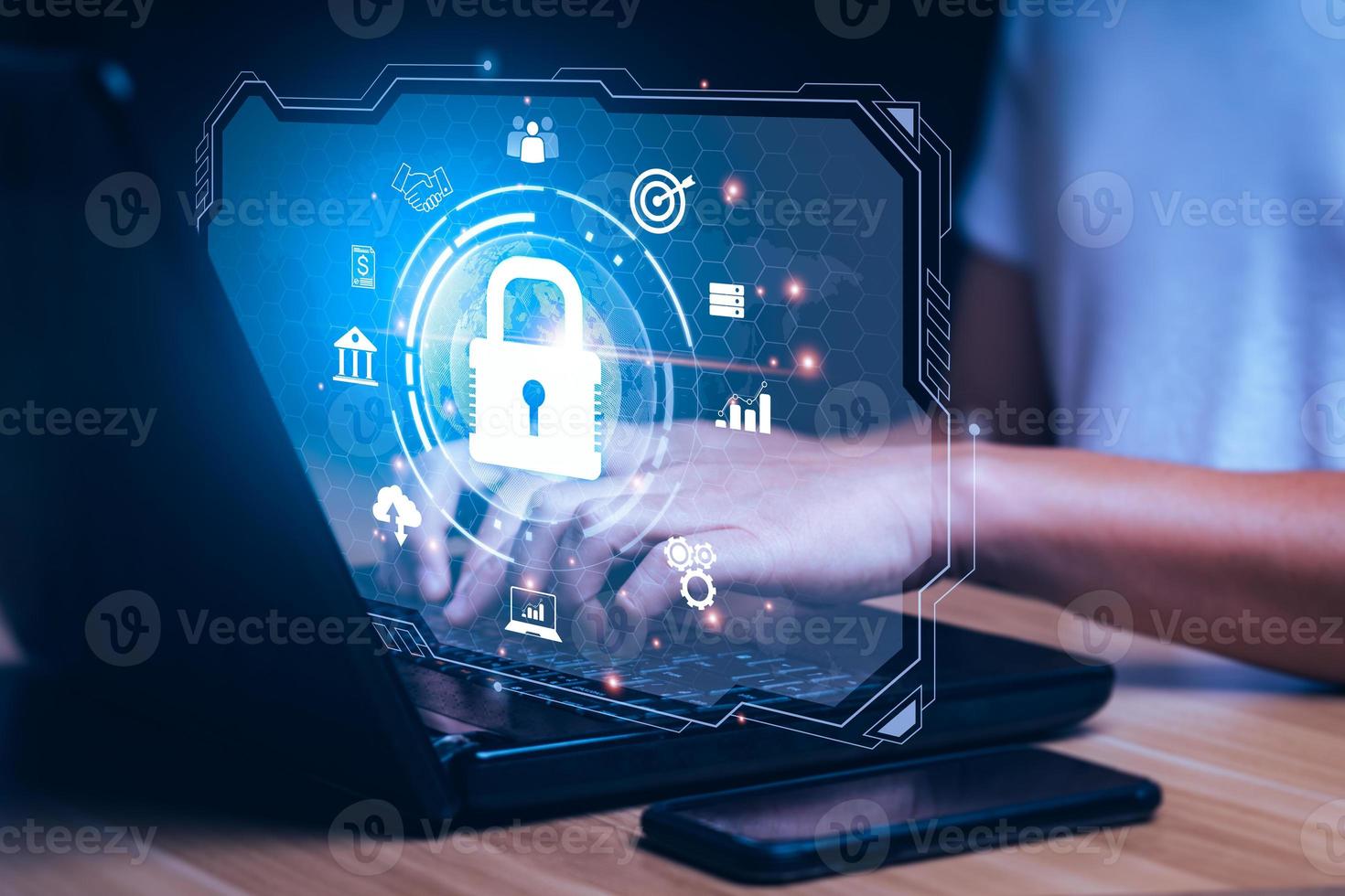 Concept cybersecurity and, of data, network. Data protection programmer with laptop computer with padlock icon. customer confidential information. hacker digital crime, online scammers Pro Photo