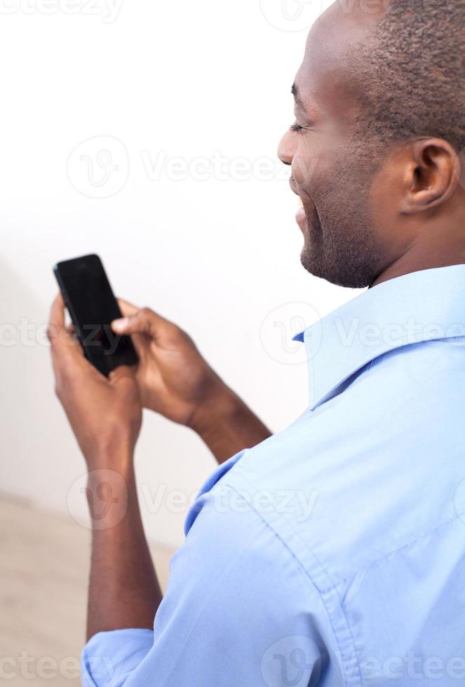 Typing a message. Rear view of cheerful black man typing something on the mobile phone and smiling while standing isolated on grey Pro Photo