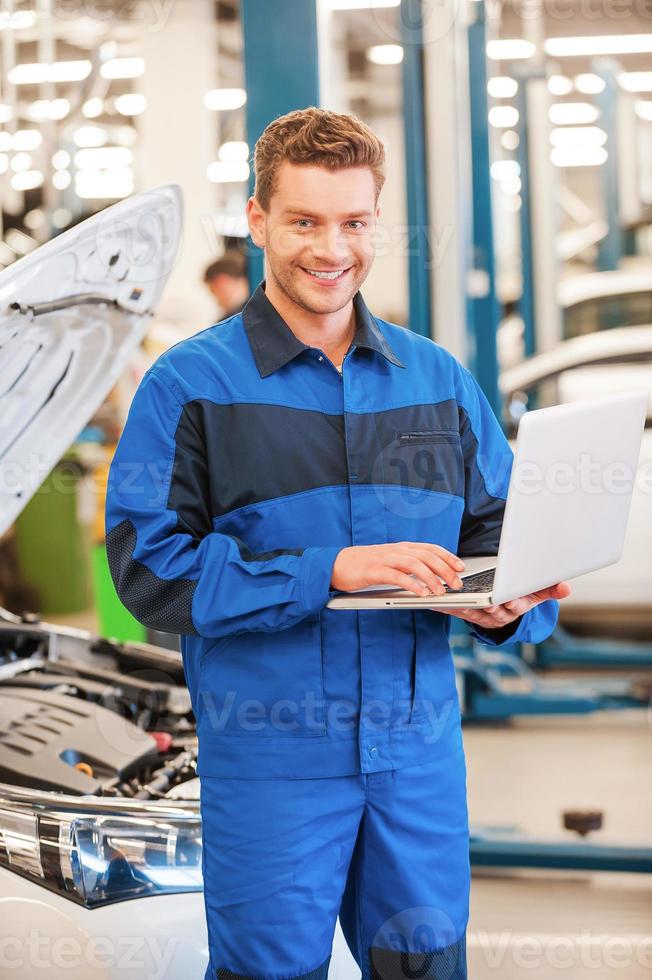 Full of confidence and expertise. Confident young man working on laptop and smiling while standing in workshop with car in the background Pro Photo