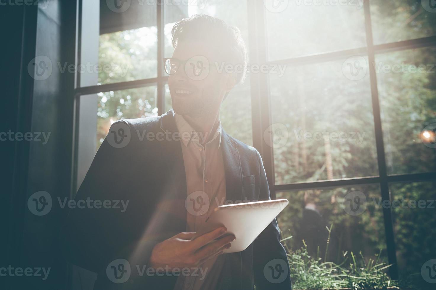 Technologies making life easier. Close-up low angle view of young man working on digital tablet while standing in front of the big window in office or cafe Pro Photo