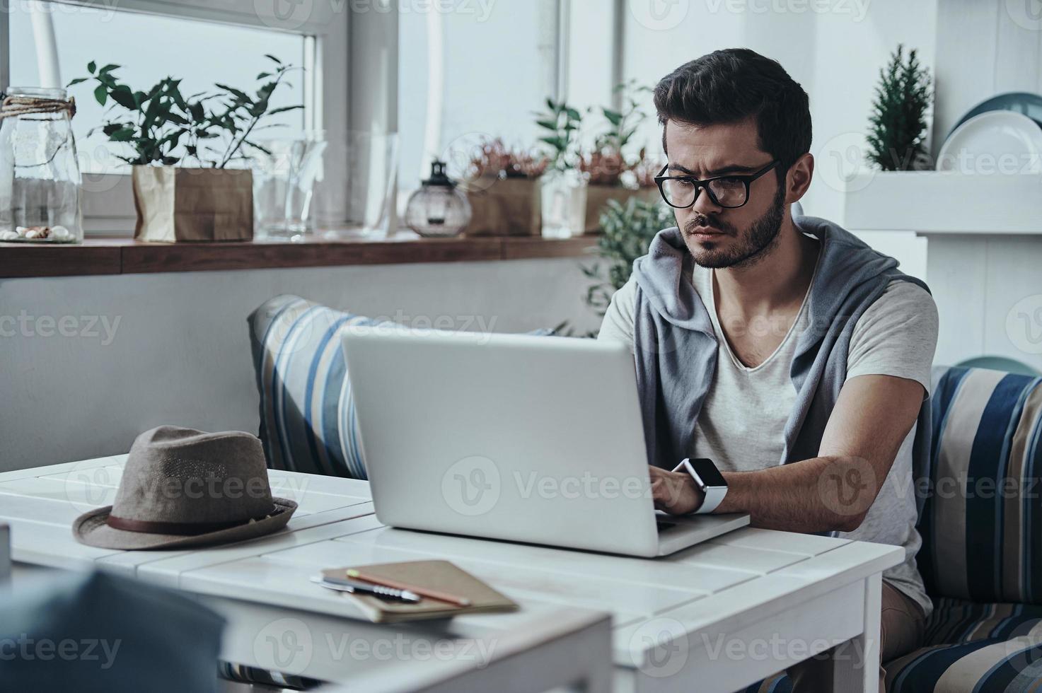 Putting ideas into something real. Handsome young modern man in eyewear using computer while sitting on the sofa Pro Photo