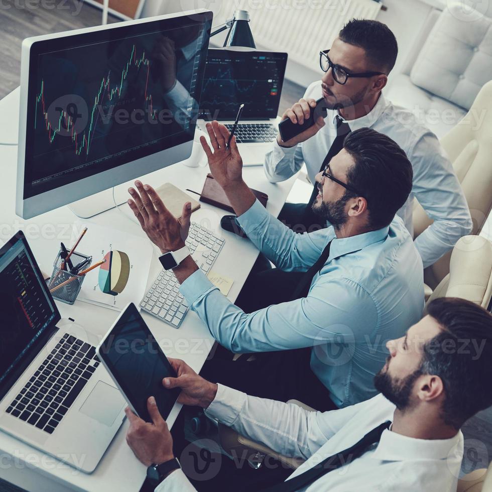 Considering the next step. Top view of young modern men in formalwear analyzing stock market data while working in the office Pro Photo