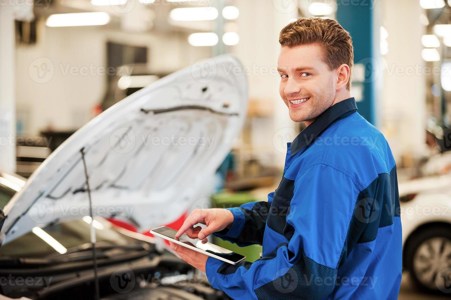 Years of mechanical experience. Confident young man working on digital tablet and smiling while standing in workshop with car in the background Pro Photo