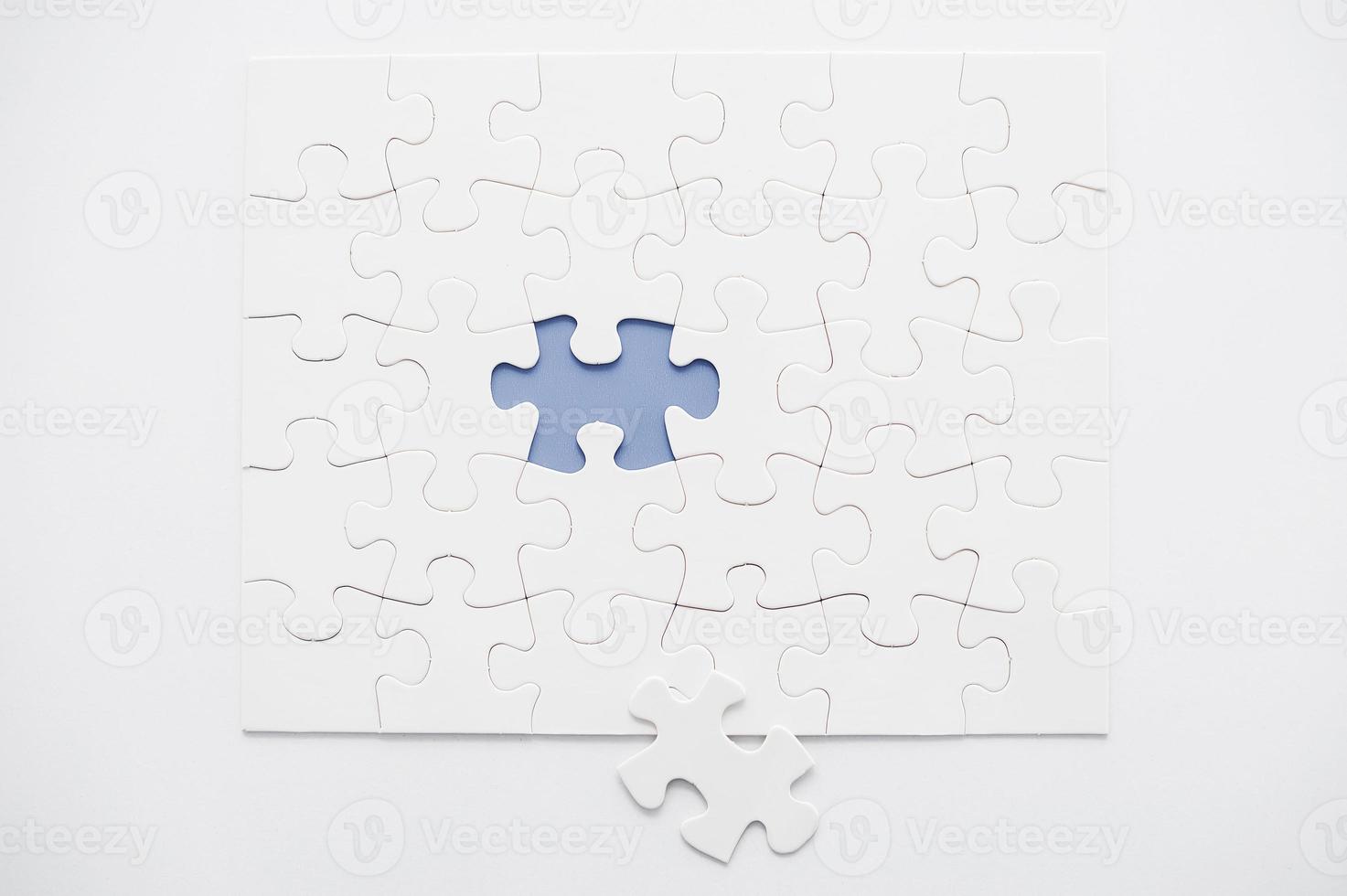 The last one element. Top view of puzzle with the last one element laying near it Pro Photo