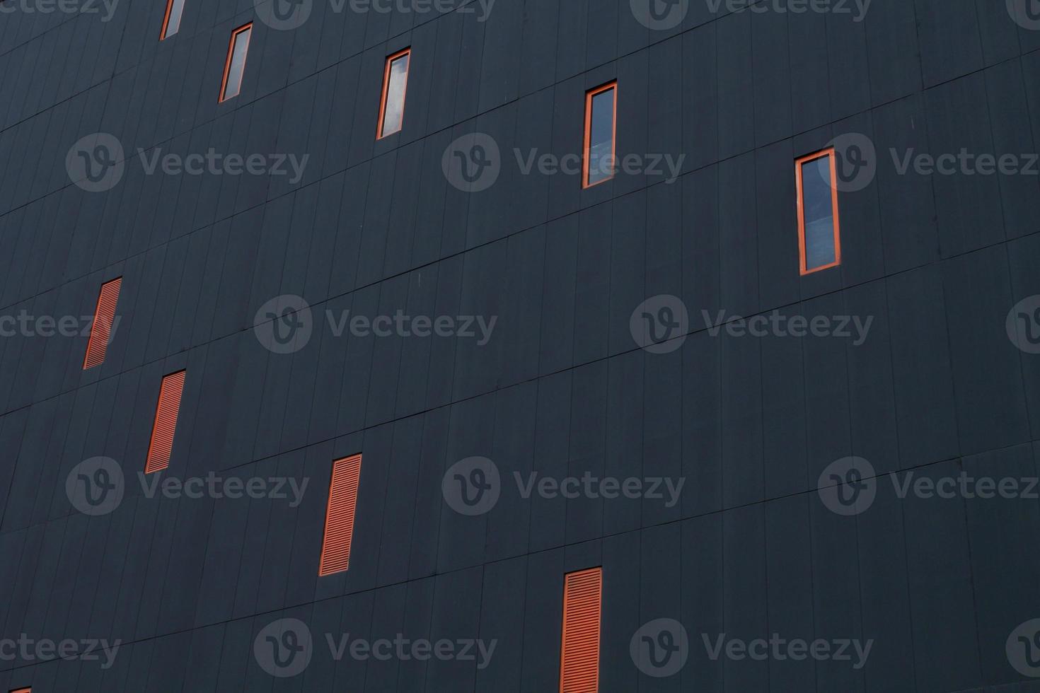Architecture fragment of geometry with windows in orange frame on deep grey background. Pattern texture of facade in modern building. Pro Photo