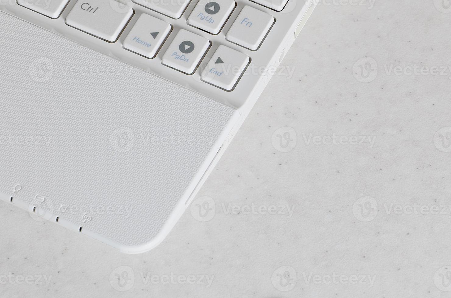 The element of the white compact modern netbook. Photo with a fragment of the computer keyboard with flat white buttons with copy space Pro Photo