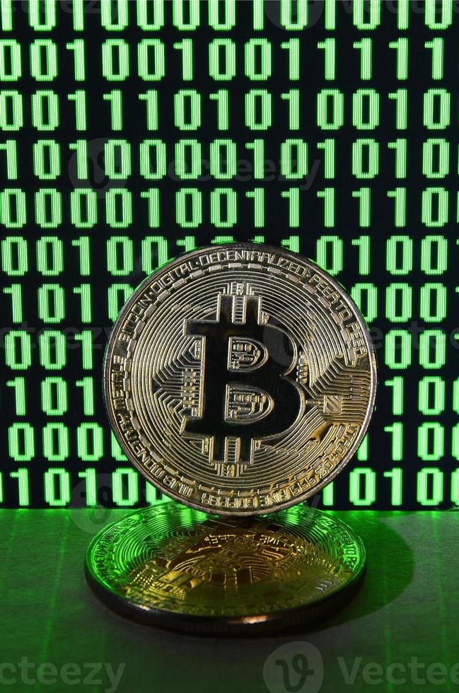 A pair of bitcoins lies on a cardboard surface on the background of a monitor depicting a binary code of bright green zeros and one units on a black background. Low key lighting Pro Photo