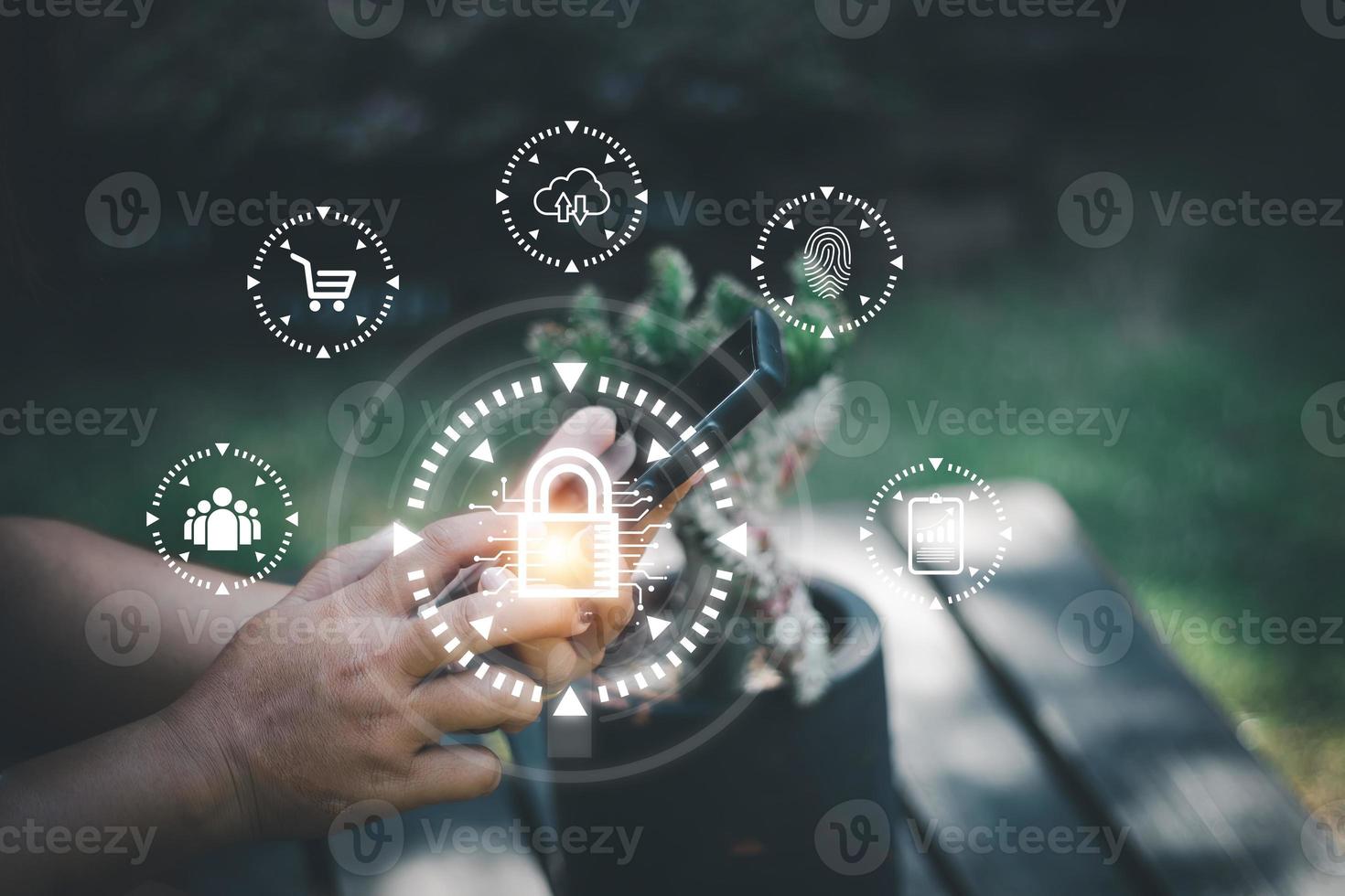 cyber security concept Man's hand using a smartphone showing a padlock icon to show that the smartphone is protected from hackers from hacking, logging in. online trading or use of social media Pro Photo