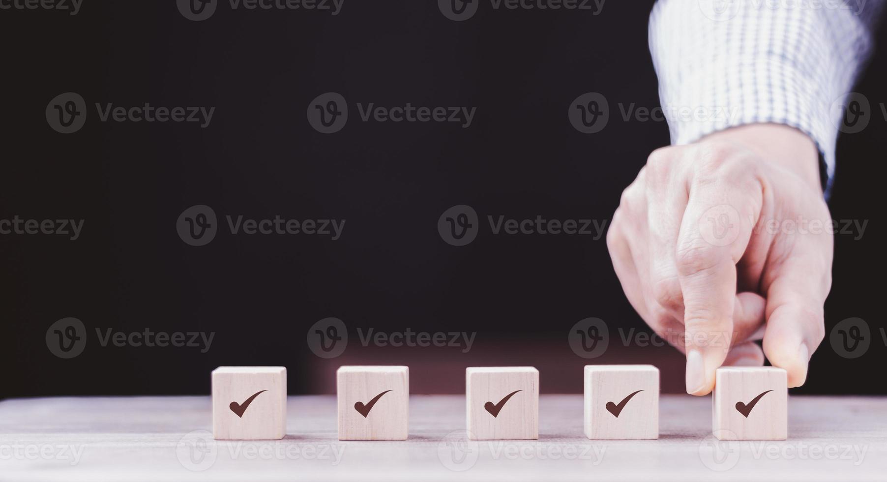 Checklist Survey and assessment concept, human hand putting cube wood with Check mark icon on wooden blocks, gray background with copy space Pro Photo