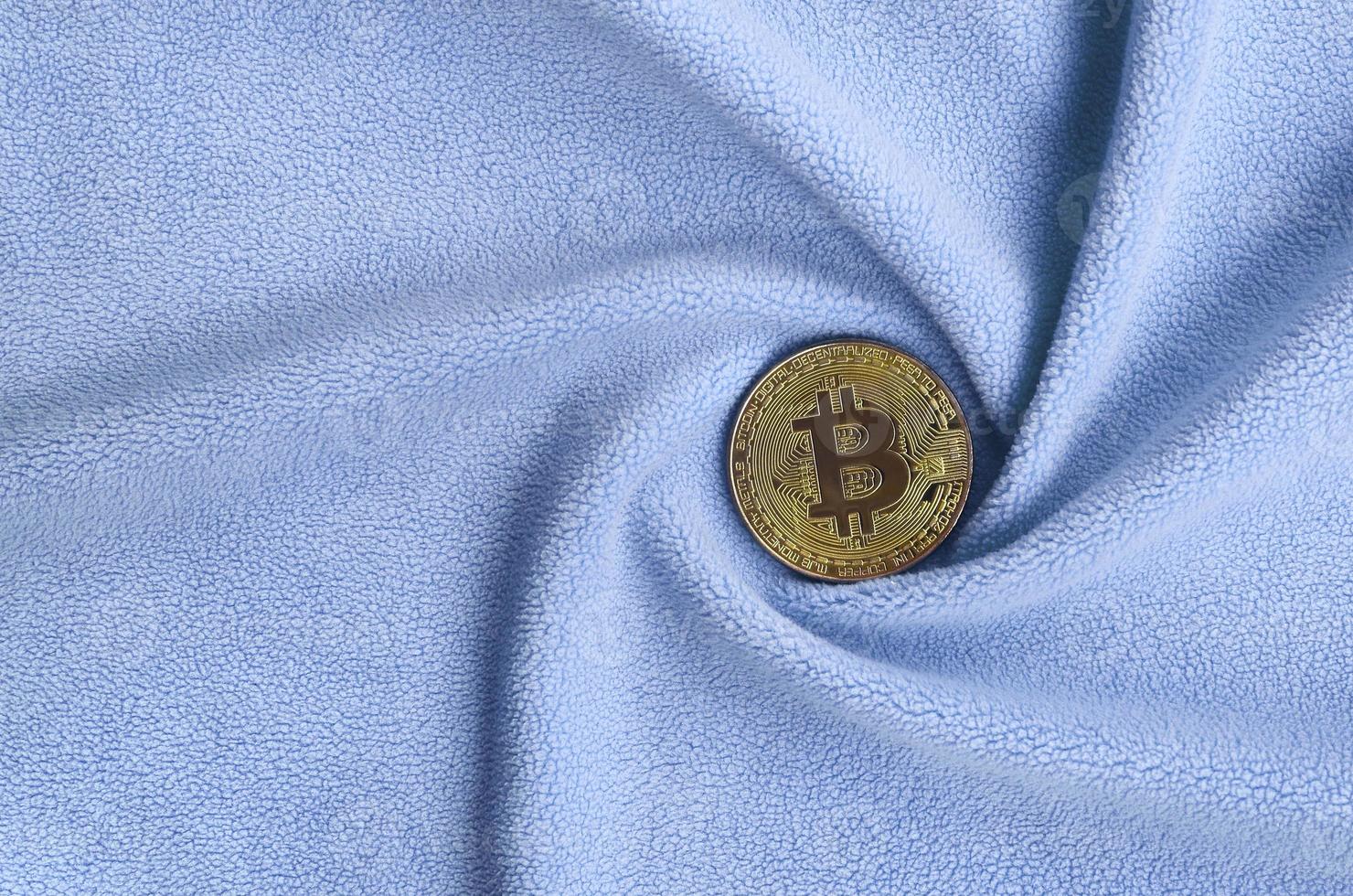 The golden bitcoin lies on a blanket made of soft and fluffy light blue fleece fabric with a large number of relief folds. The shape of the folds resembles a fan from a video card cooler Pro Photo